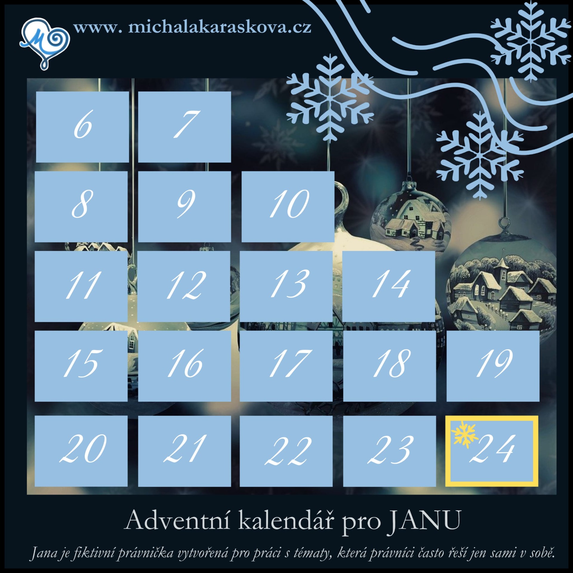 Tento adventní kalendář je vytvořen pro JANU — fiktivní právničku, jejíž příběh nese kousek reality mnoha z nás.