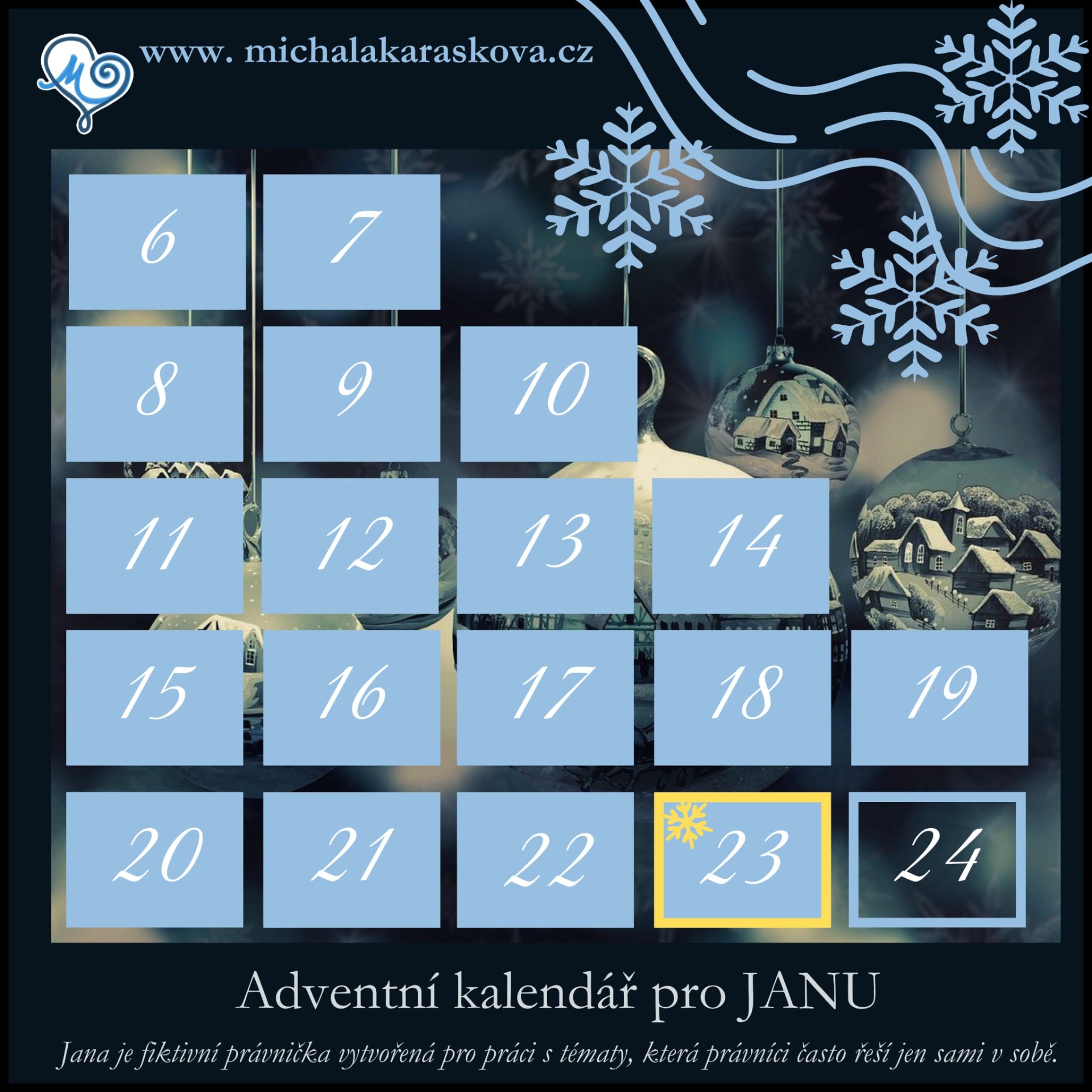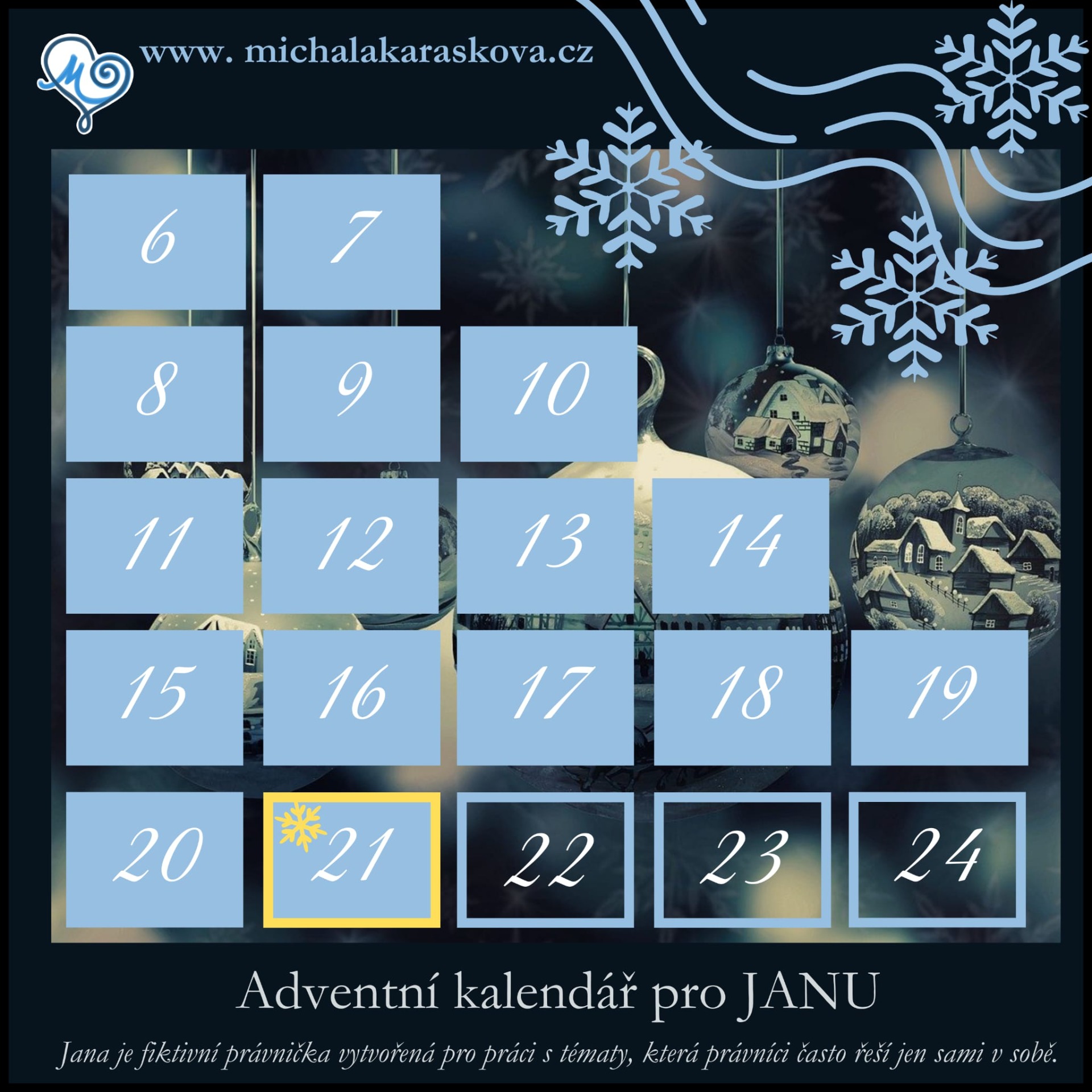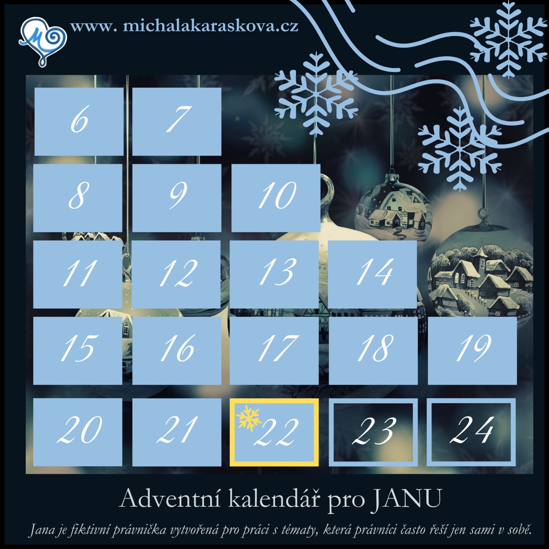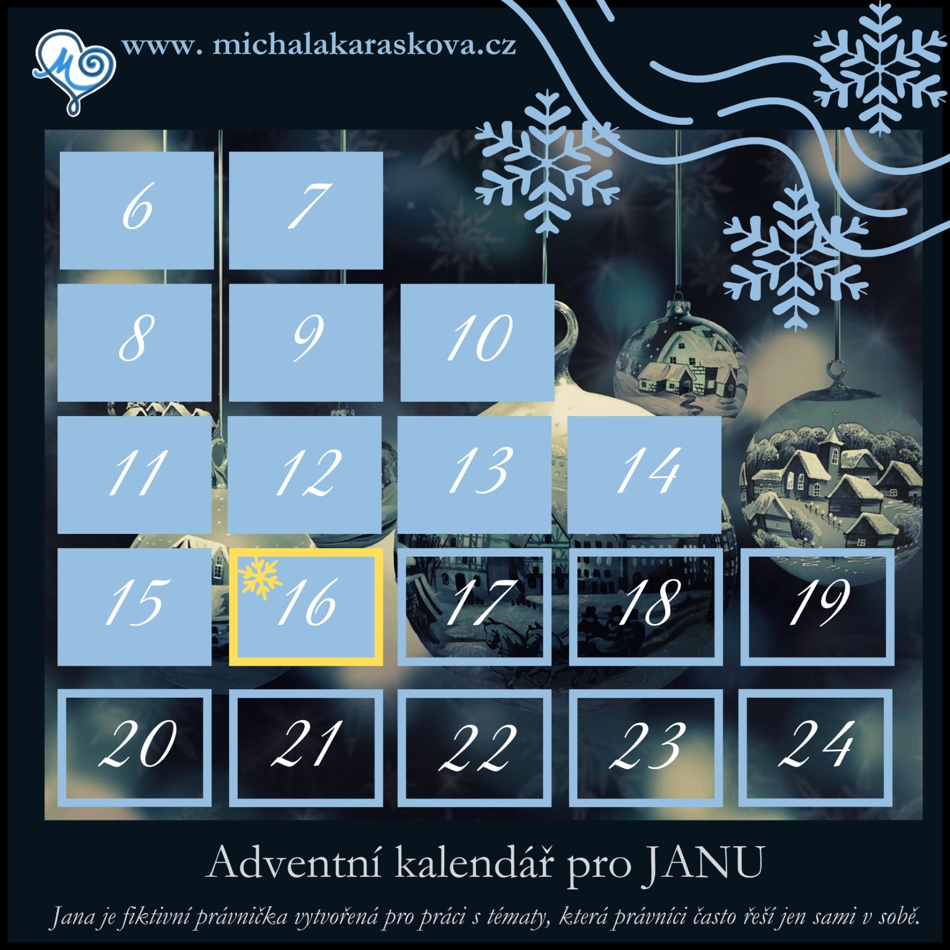 Tento adventní kalendář je vytvořen pro JANU — fiktivní právničku, jejíž příběh nese kousek reality mnoha z nás.