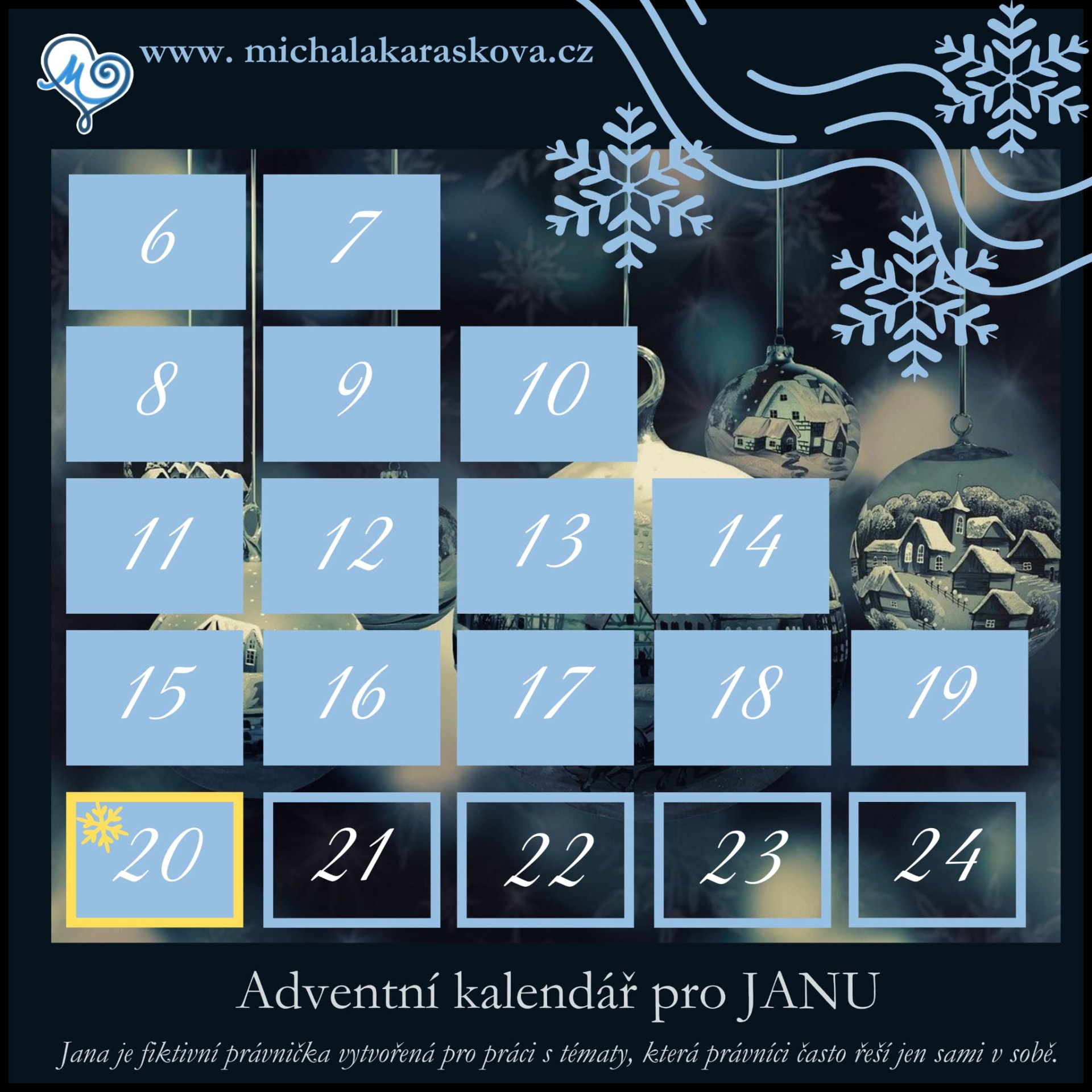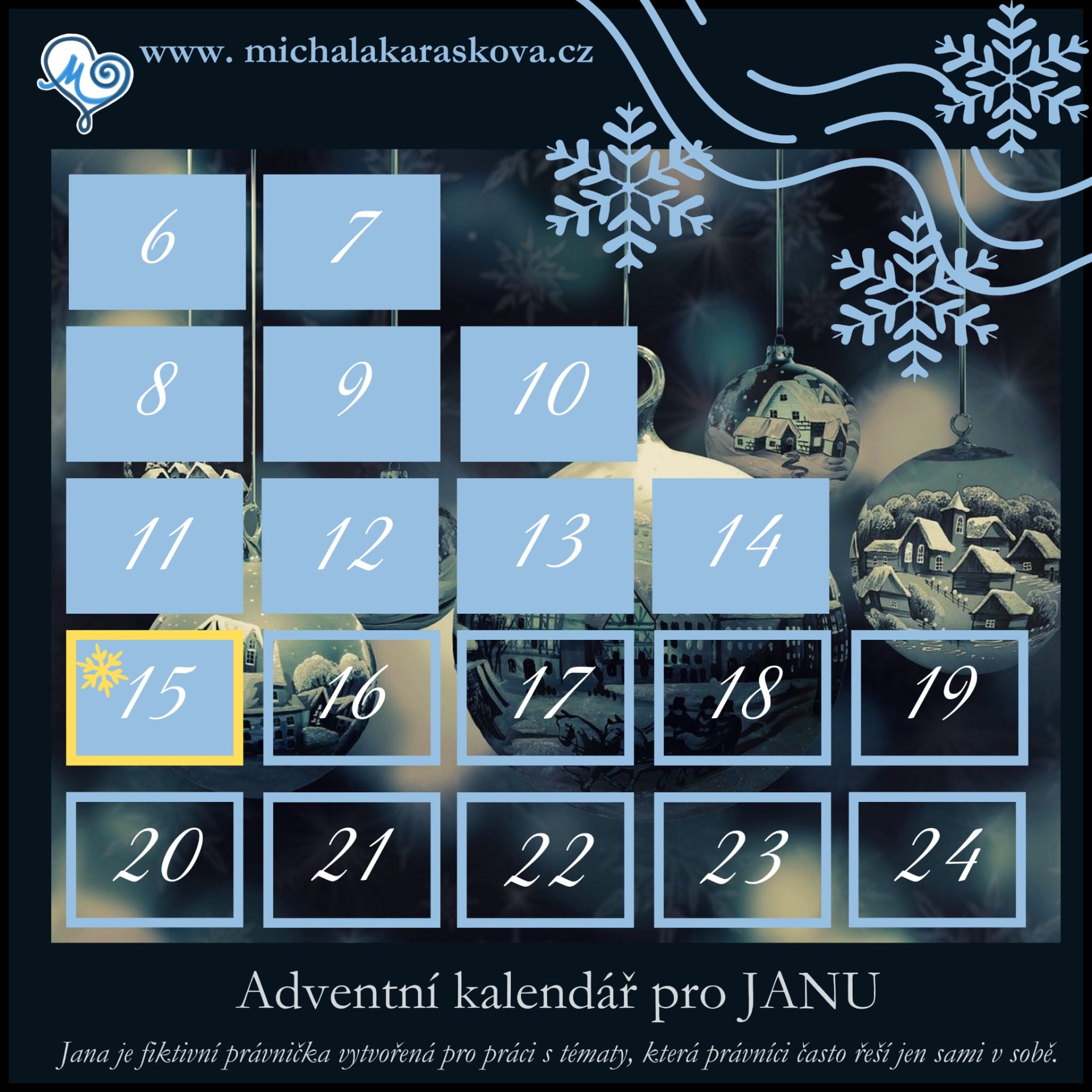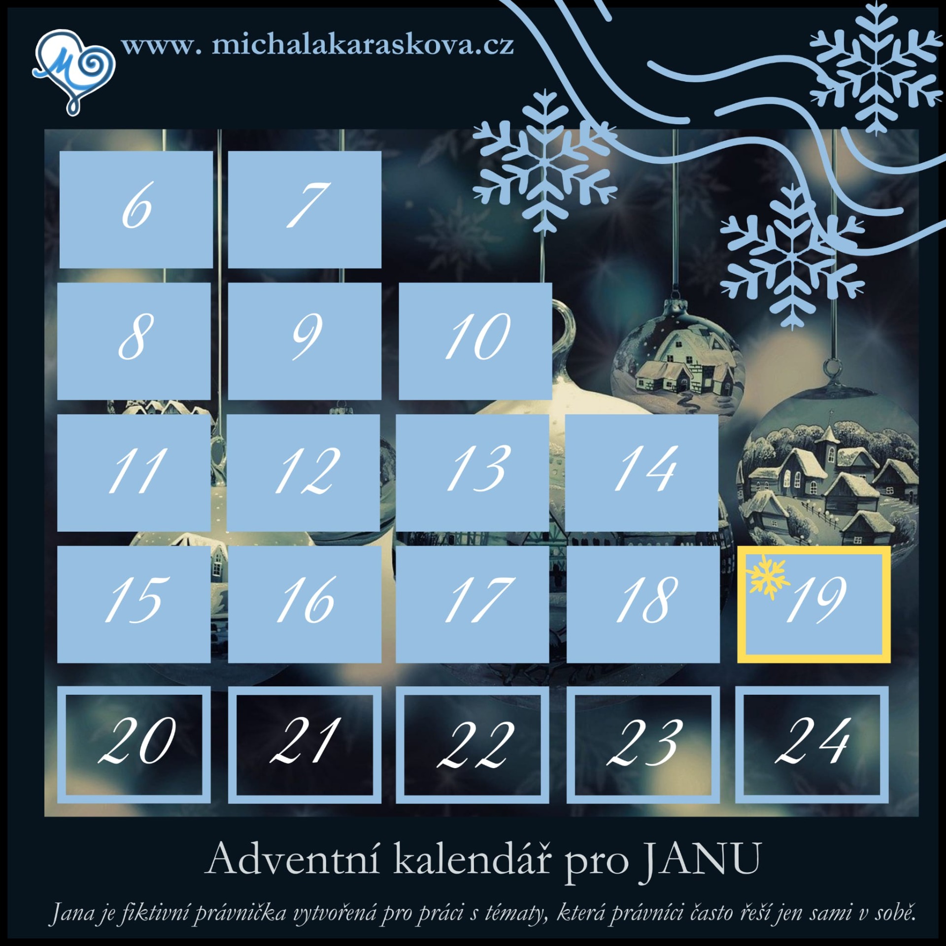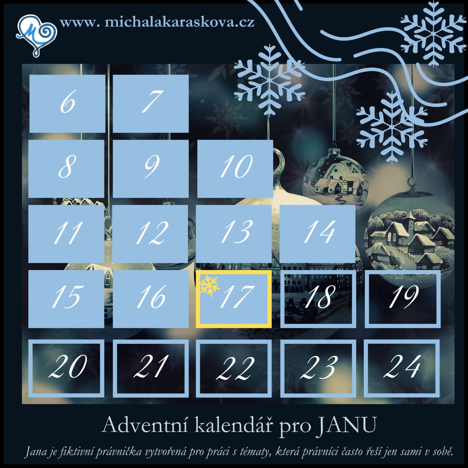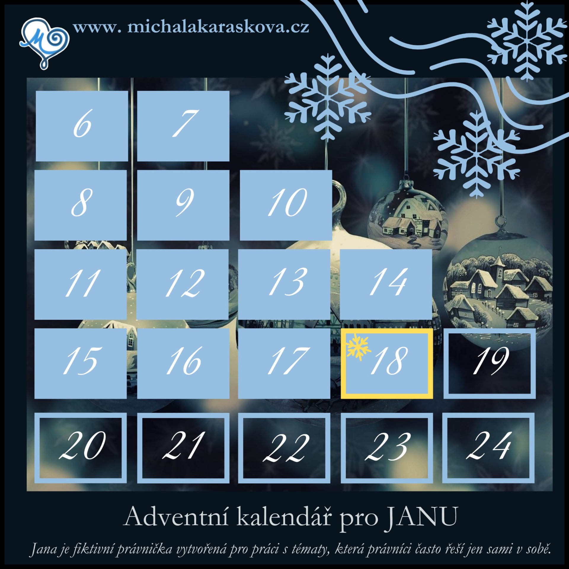 Tento adventní kalendář je vytvořen pro JANU — fiktivní právničku, jejíž příběh nese kousek reality mnoha z nás.
