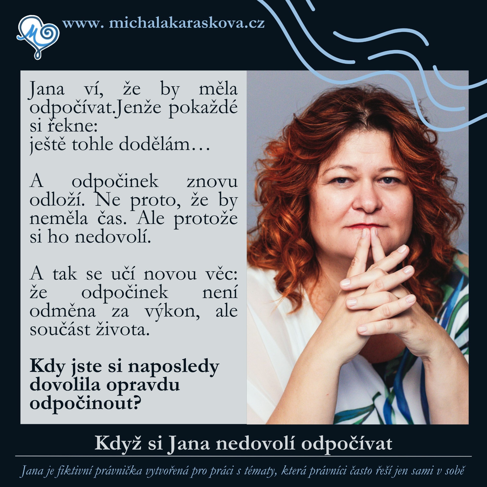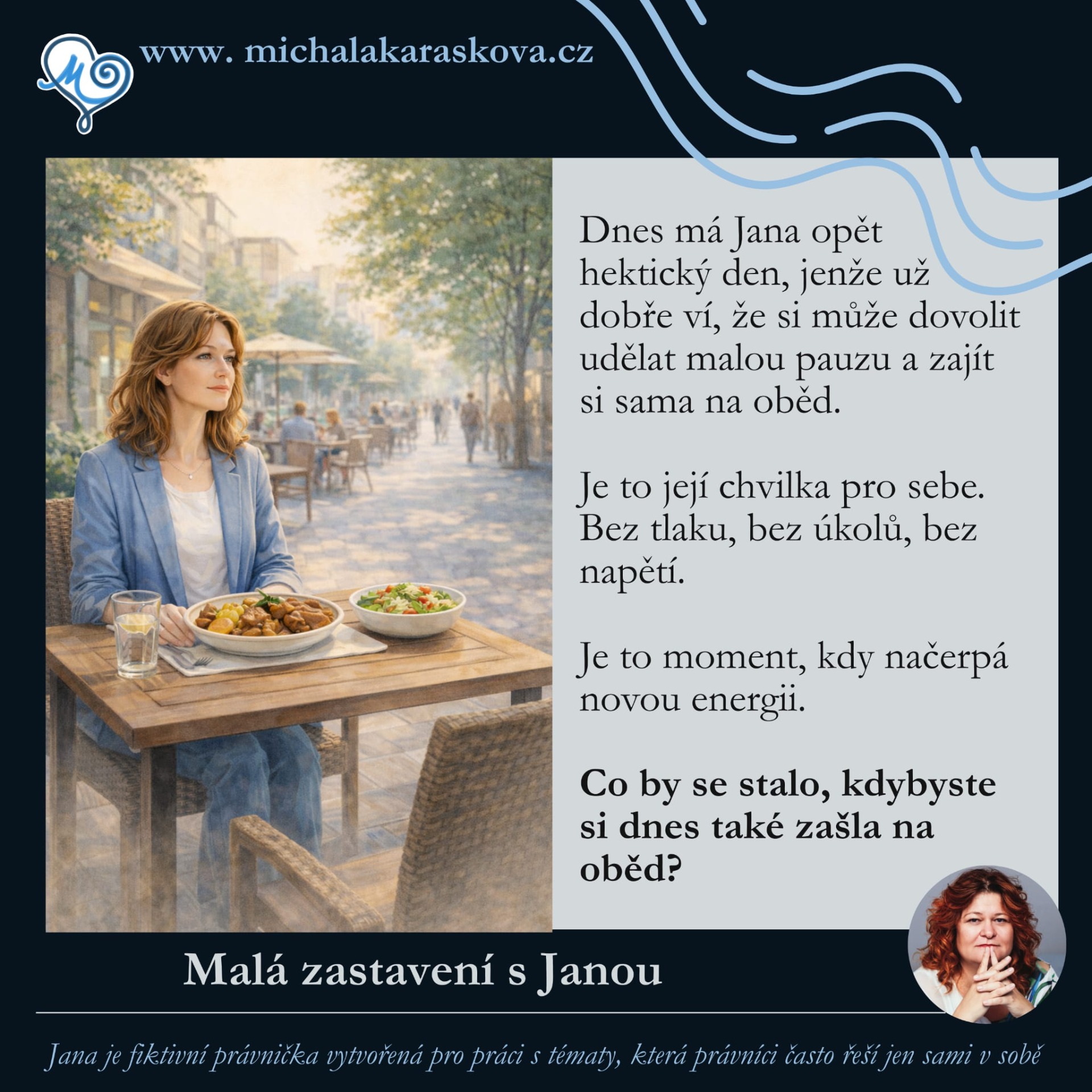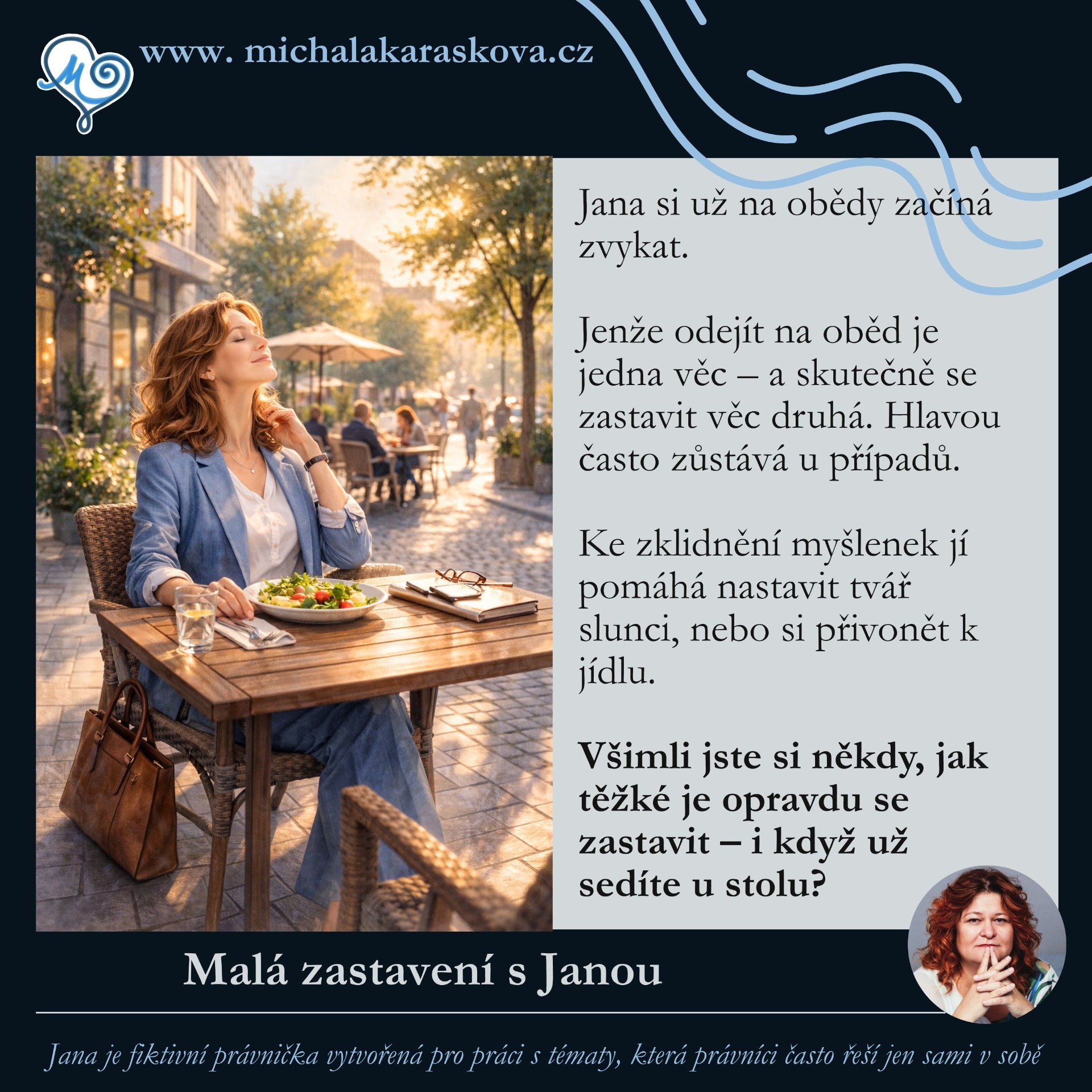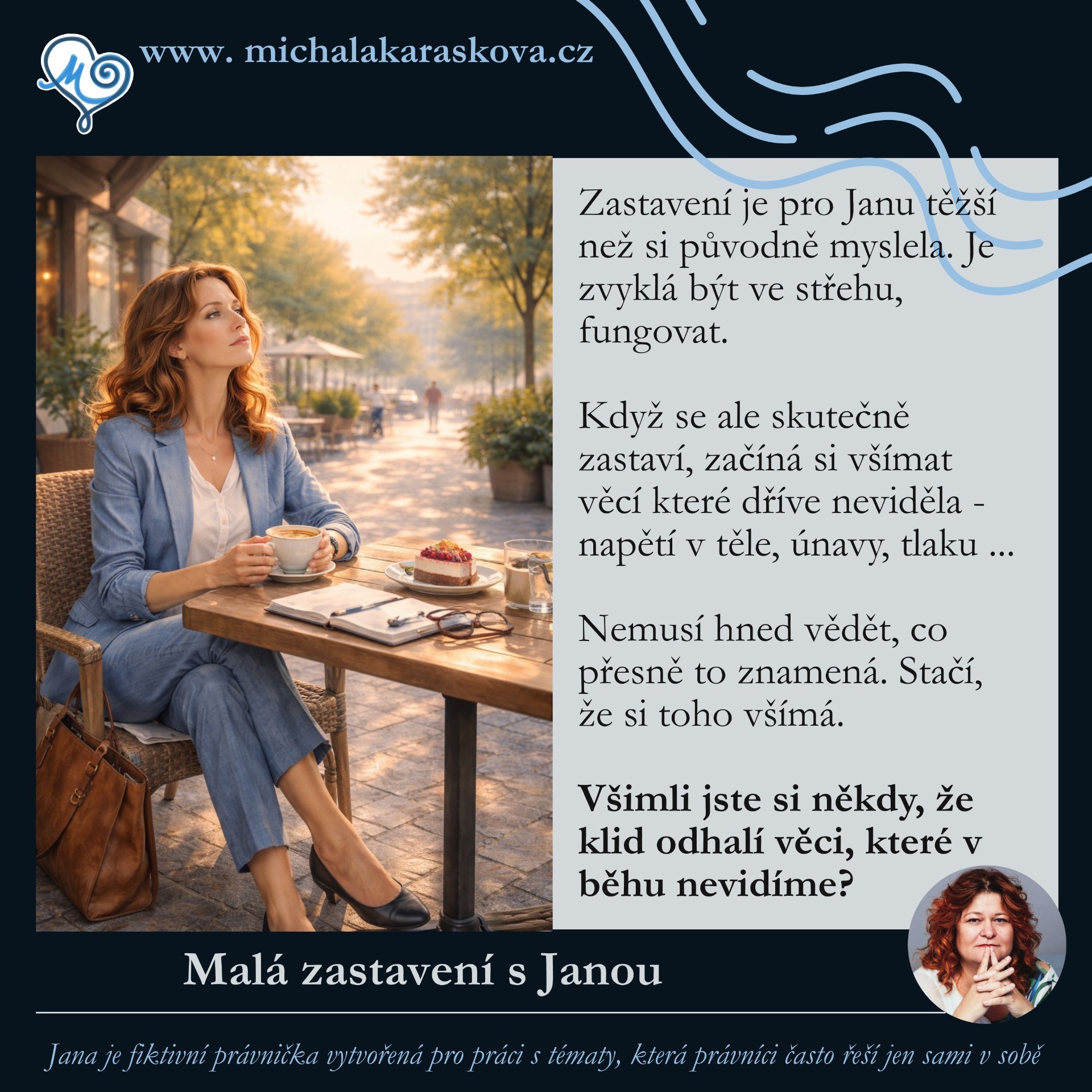 Jana je fiktivní právnička. Přemýšlivá, zodpovědná… a občas unavená z toho, že musí všechno zvládnout.